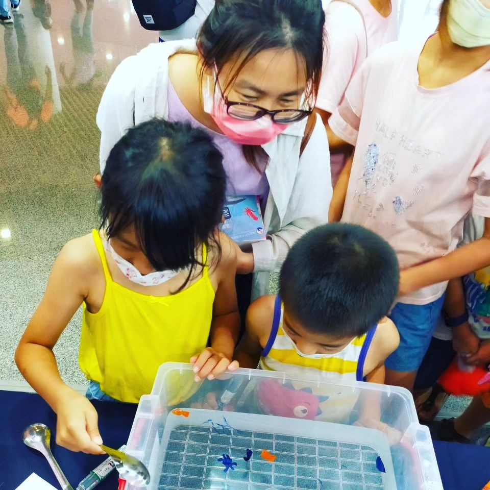 利用密度原理,使白板筆繪畫出的海洋生物能夠漂浮在水中🐬,再透過不同媒介現撈起,將自己的創作帶回家!